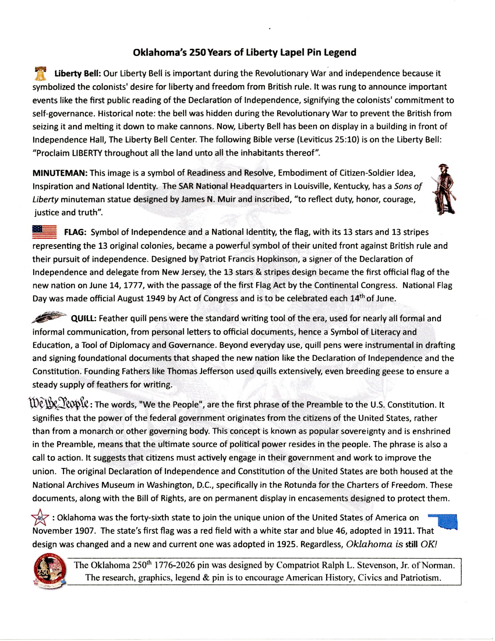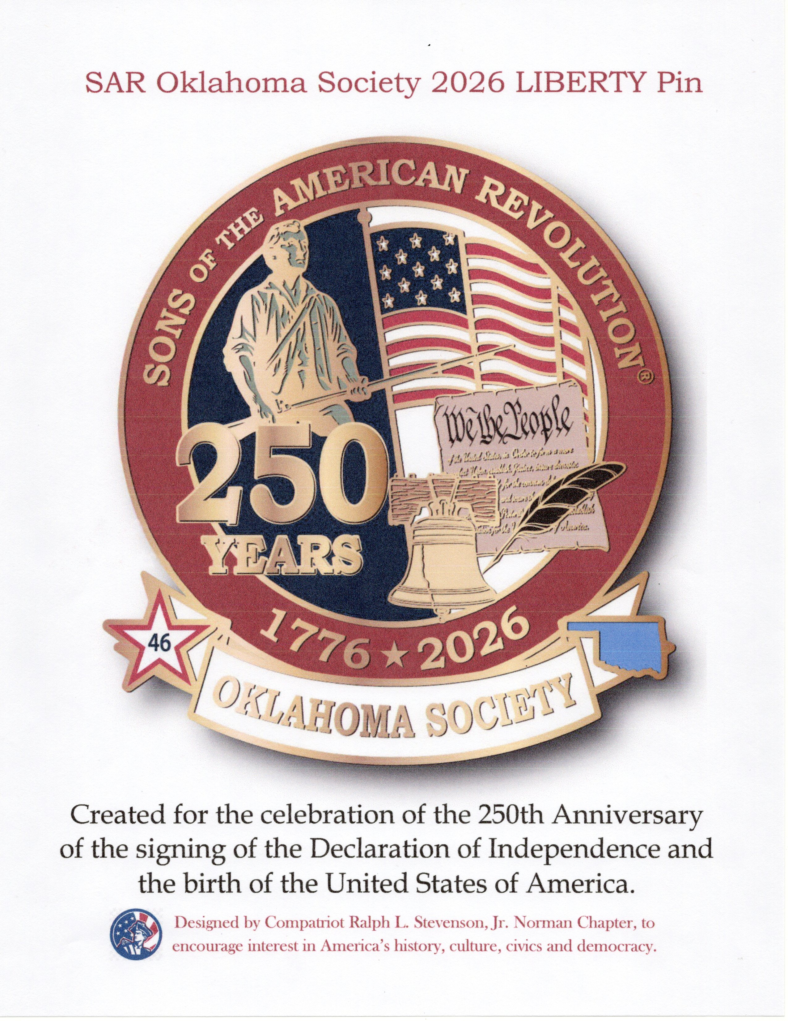 The Oklahoma SAR 250th Anniversary designed by Compatriot Ralph Stevenson is now available. These proceeds will be used as a fund raiser for our 250th anniversary activities.